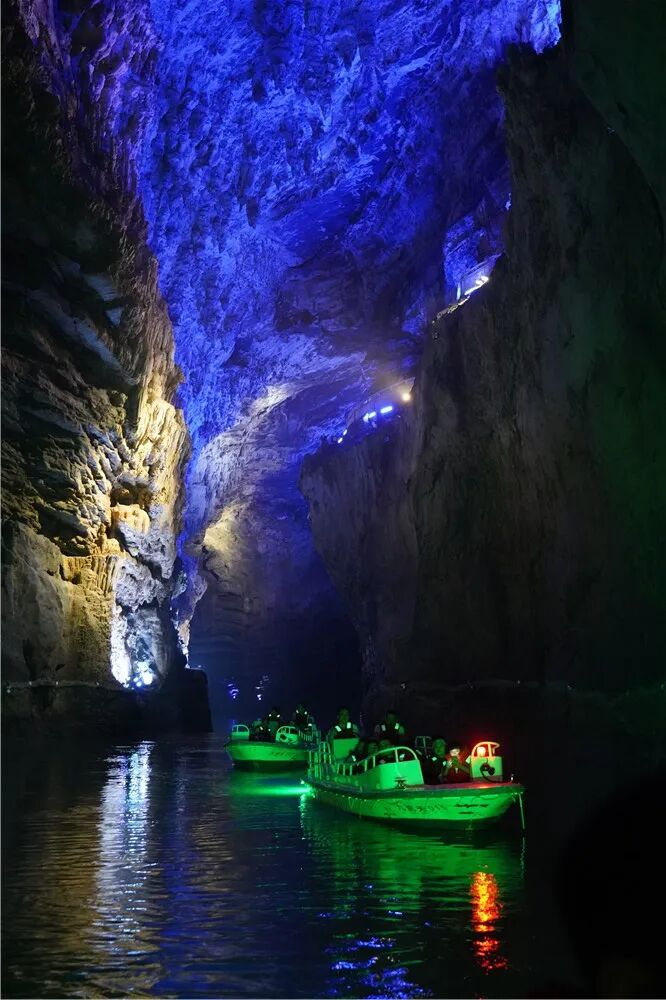 这里有世界上可供乘船游览的最高大的溶洞群,可以乘船穿梭在九个洞天之间,九个洞天各具特色。