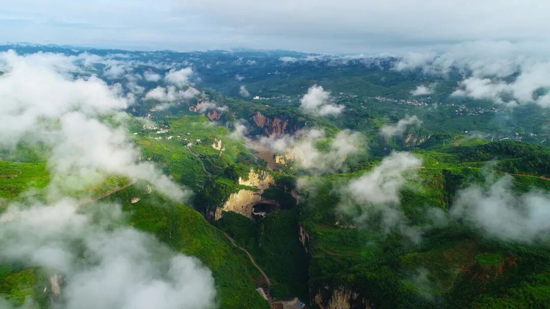 这里有世界上最密集的天窗溶洞群,入地的伏流在长达两公里的暗河上,形成连续九个天窗,其中最高的天窗-大观天桥高214米,孔高90.2米。