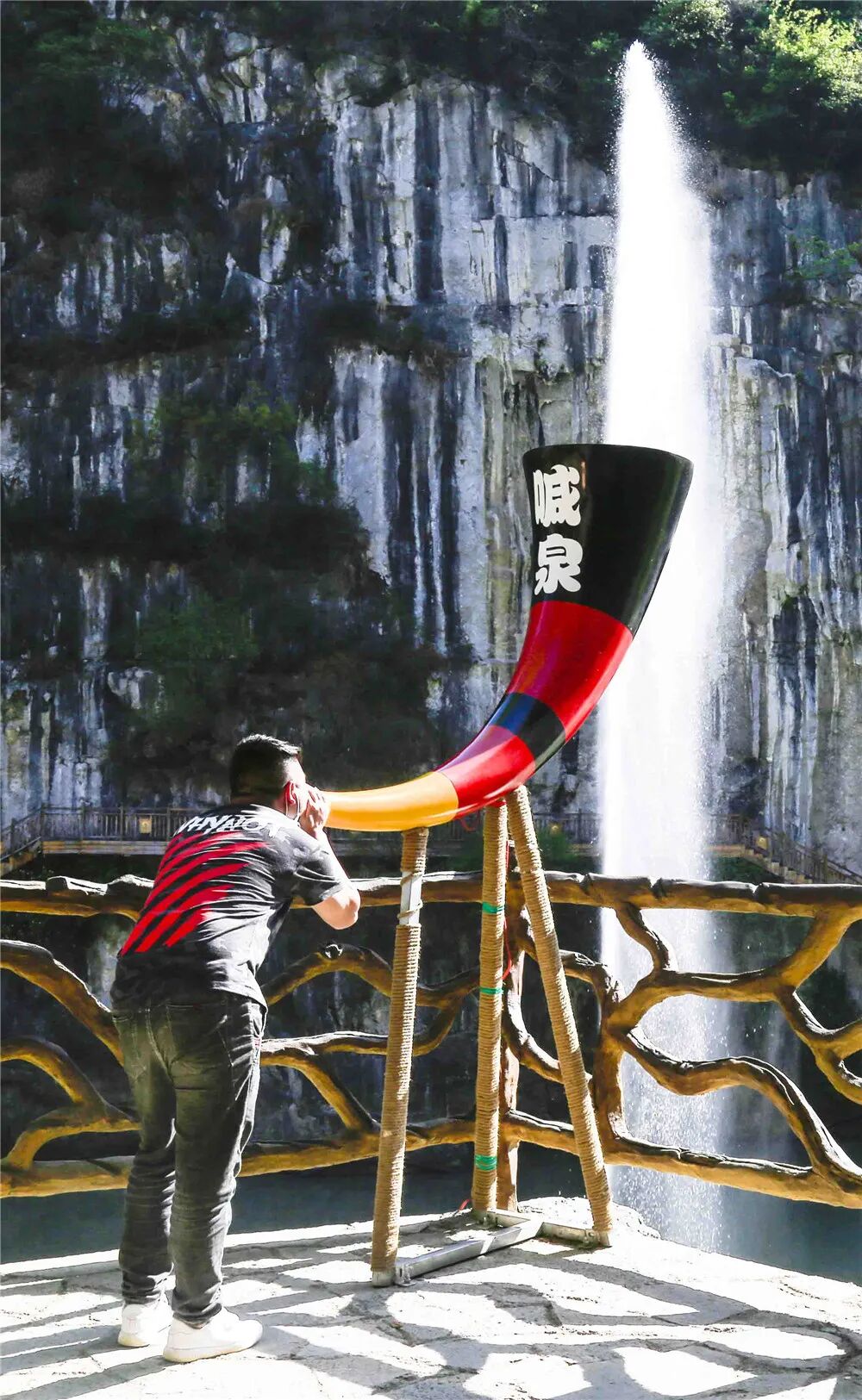 许多游客慕名而来,排队打卡只为在这里喊出心中深埋已久的沉闷,对着牛角似的喇叭放声呐喊,喊泉的泉水将会往上喷出,谁的声音越持久,喊泉喷得越高,比的就是耐力和肺活量。